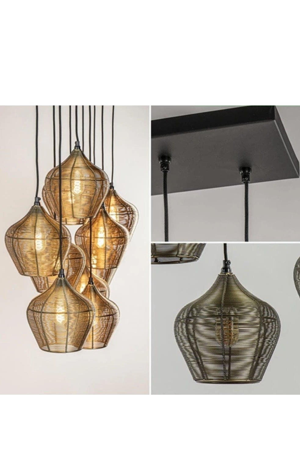 Deze grote 10 lichts hanglamp is één bonk sfeer. De kappen zijn helemaal gemaakt van metaal draad dat om een frame is gewikkeld. Het draad heeft een antiek-brons afwerking en daarmee een warme uitstraling. De kappen hebben een open structuur dus raden aan decoratieve lichtbronnen te gebruiken. De kapjes hangen met een zwart stof omwonden snoer aan de grote plafondplaat. De lampen zijn eenvoudig in hoogte verstelbaar, snoeren ijn gemakkelijk weg te werken in de grote plafondplaat. Deze prachtige hanglamp is prachtig boven een grote eettafel.