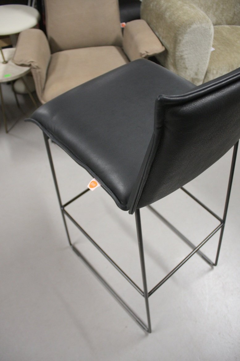 Deze handgemaakte barstoelen hebben een metalen frame (Old Glory) en zijn gestoffeerd met echt leer (Bonanza Black)