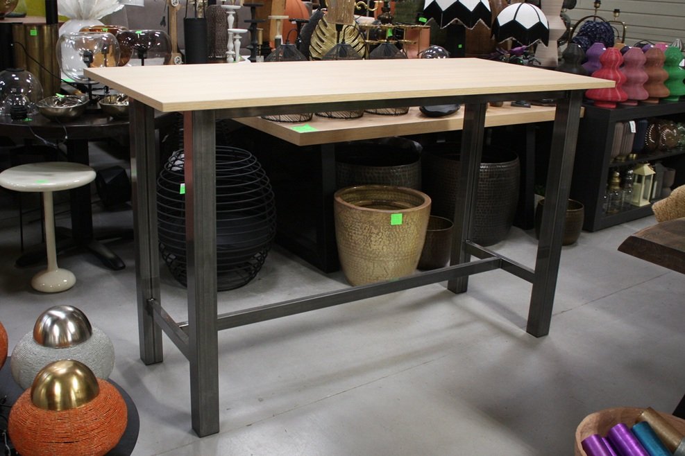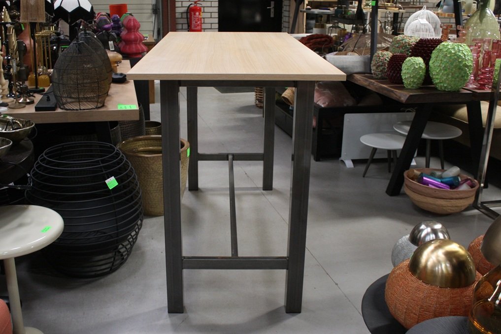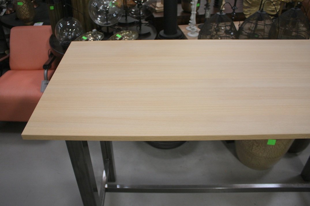 De tafel heeft een metalen onderstel (Italian Steel) en een blad van melamine met een licht houtdessin.