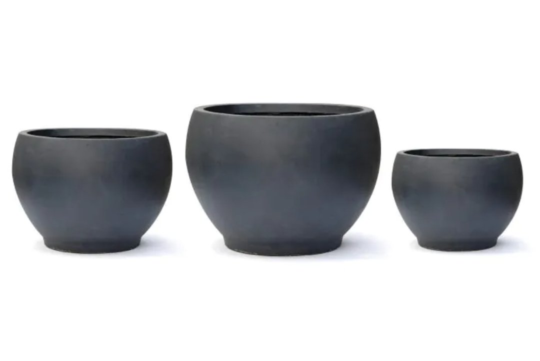 Grote nieuwe ronde Fiberstone bloempot Monika in de kleur antraciet.