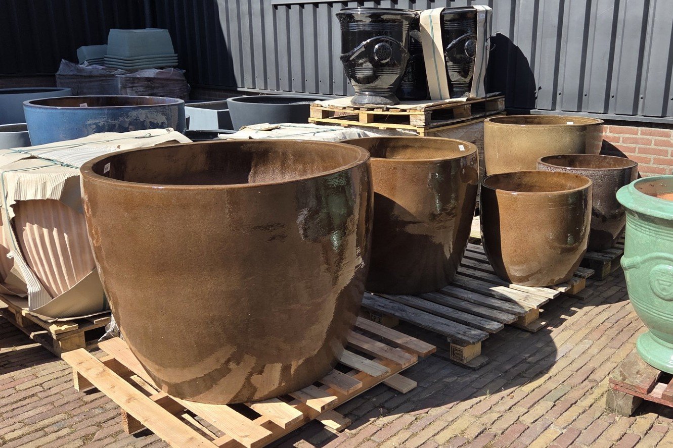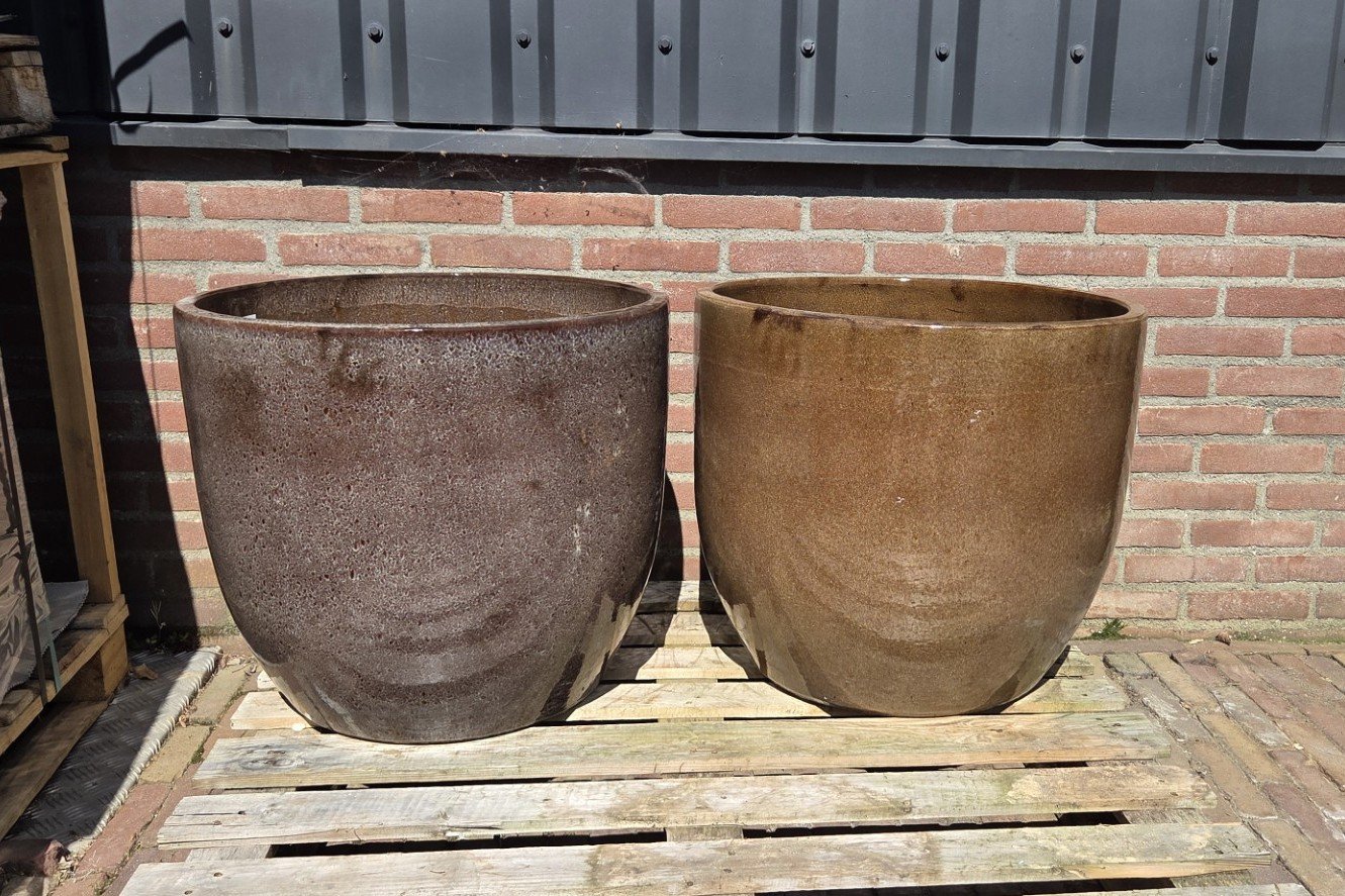 Prachtige grote ronde geglazuurde bloempotten Noble Egg in de kleur Macchiato.