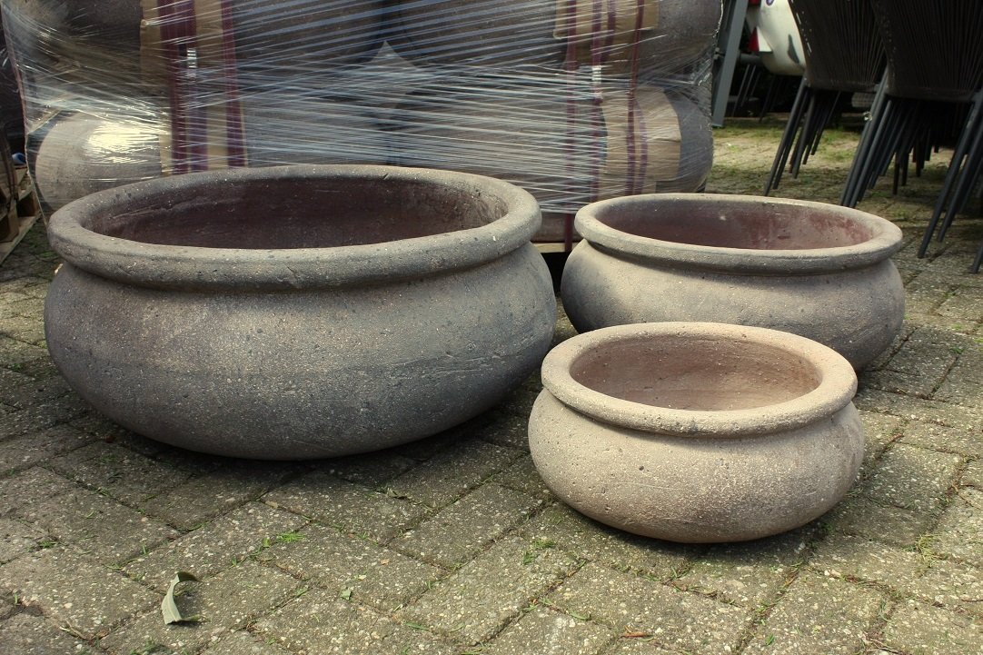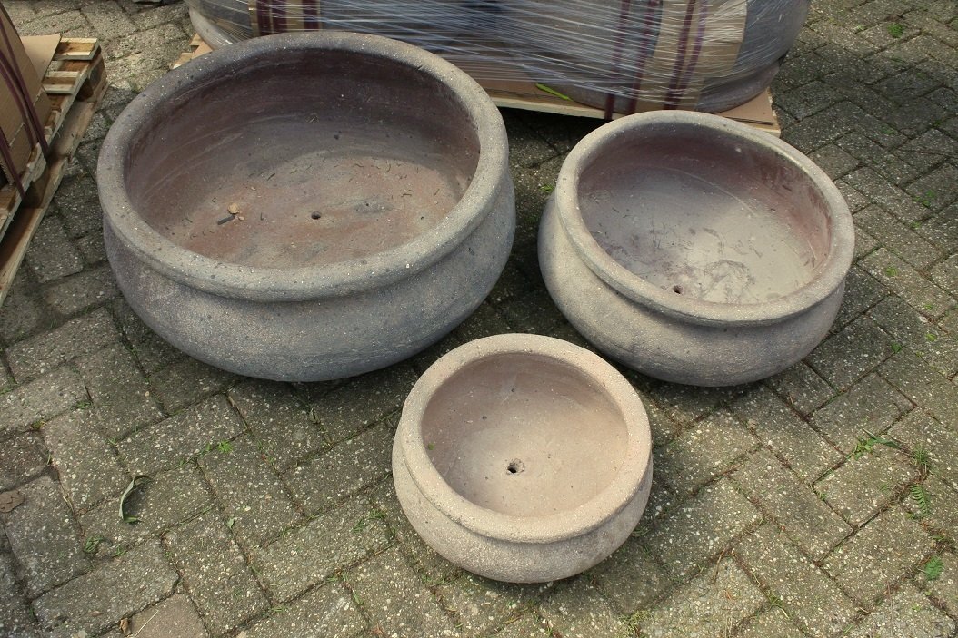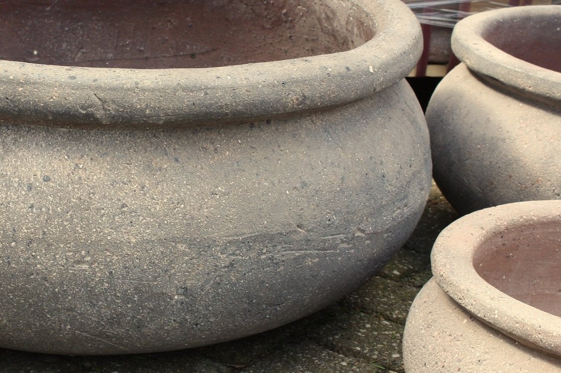 Robuuste nieuwe grote grijze ronde bloempotten / bloembakken gemaakt van cement; oersterk – zwaar – zeer bestendig tegen vorst !