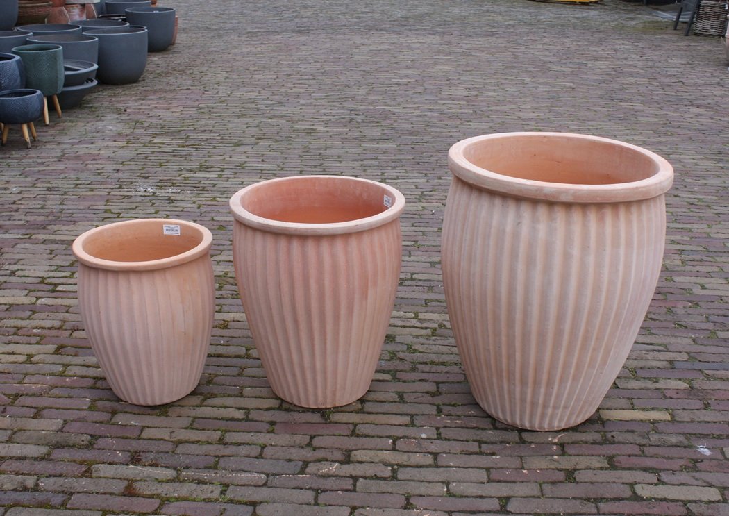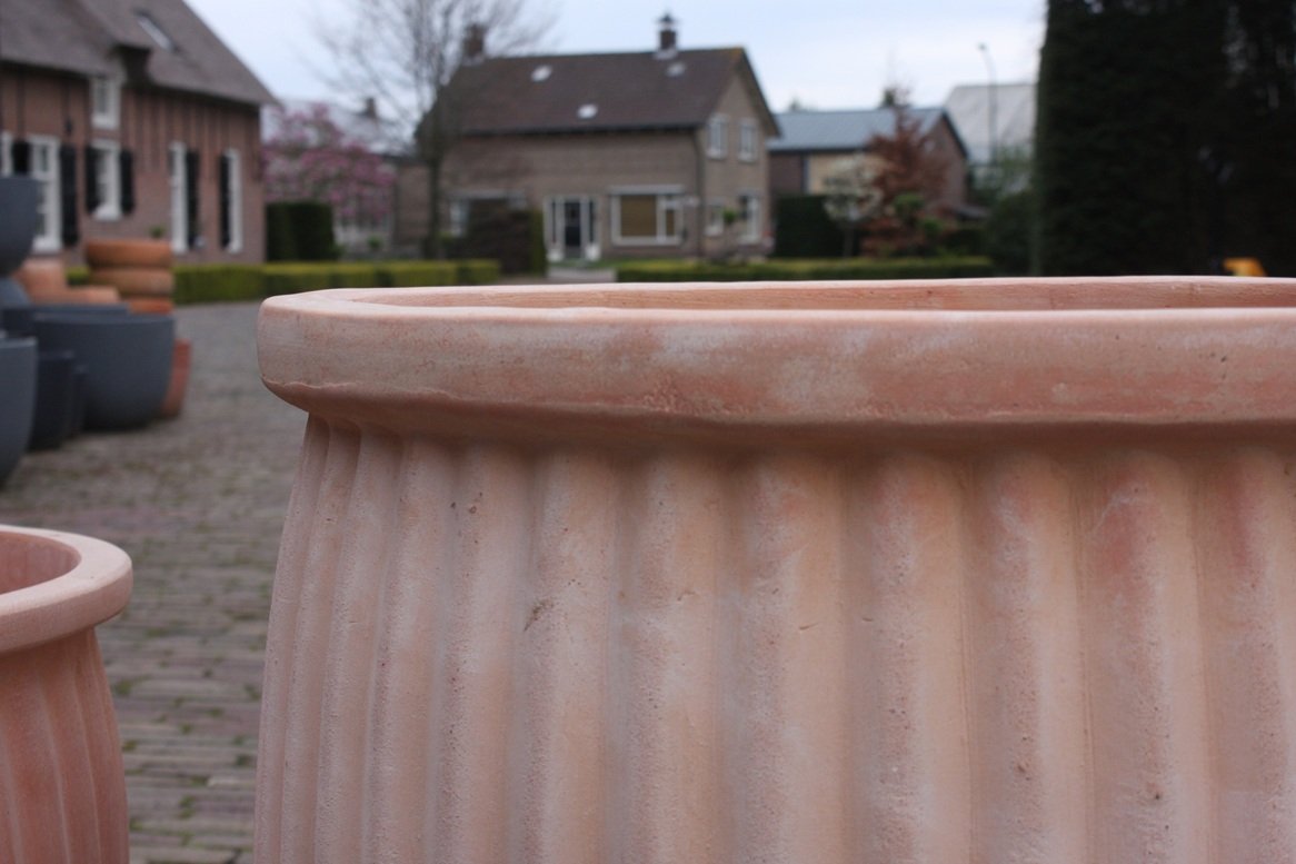Nieuwe ronde terracotta bloempot Ribbel.