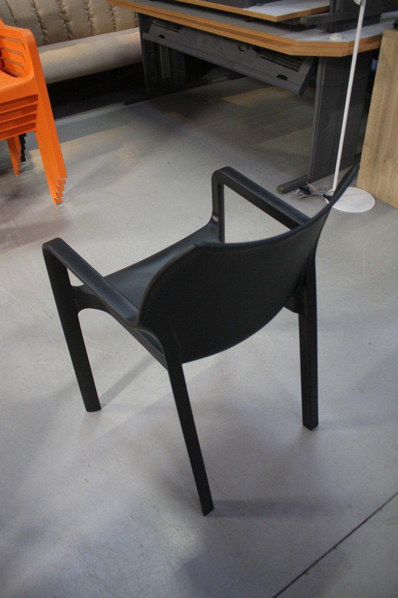 Gemaakt van kunststof, voorzien van armleuningen, stapelbaar en recyclebaar.