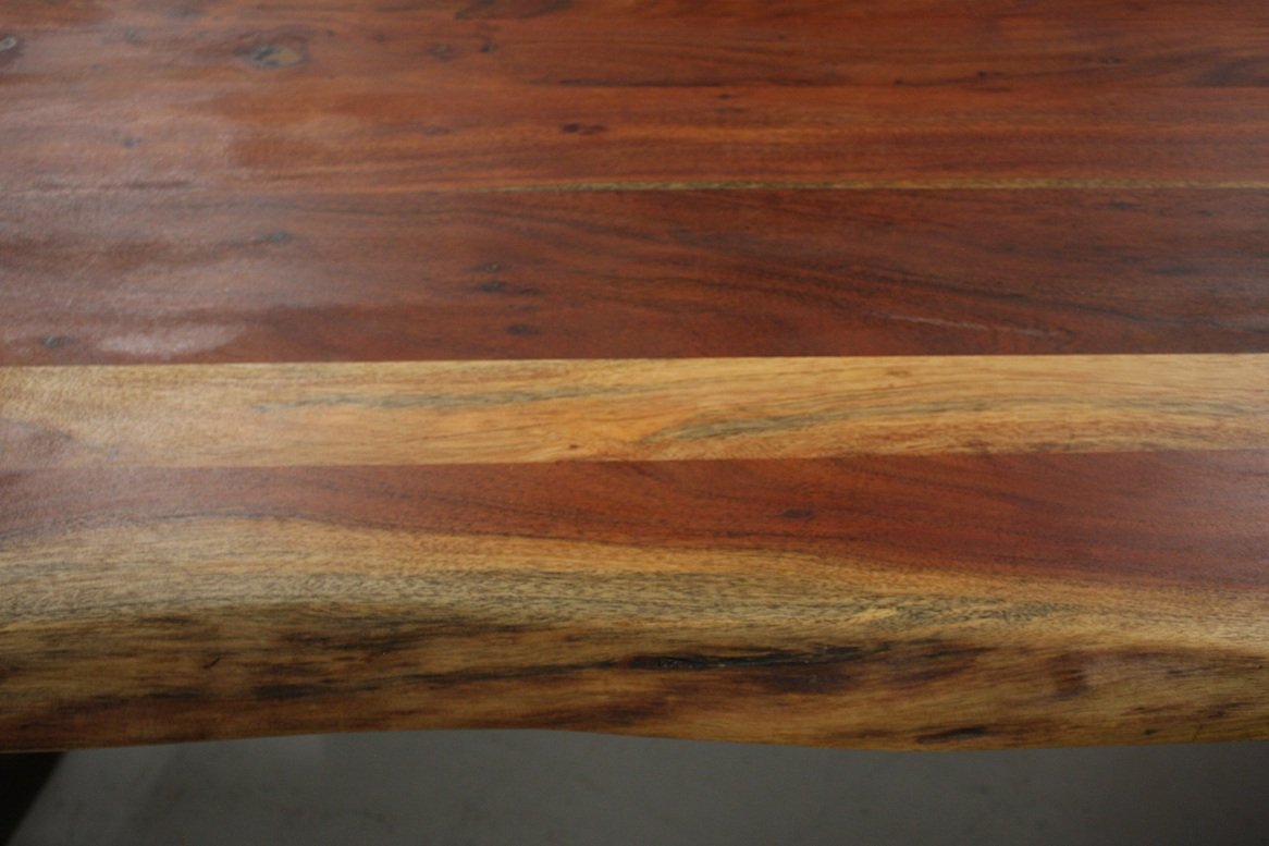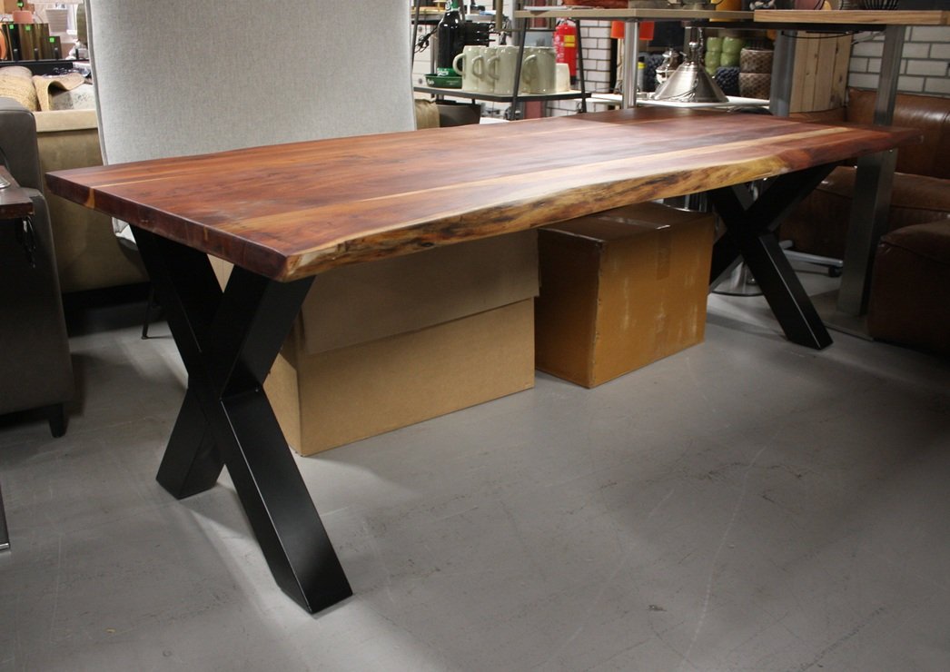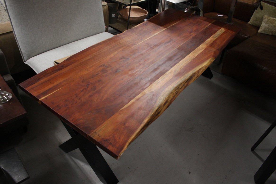 De tafel heeft een zwarte metalen kruispoot en een massief acaciahouten blad.