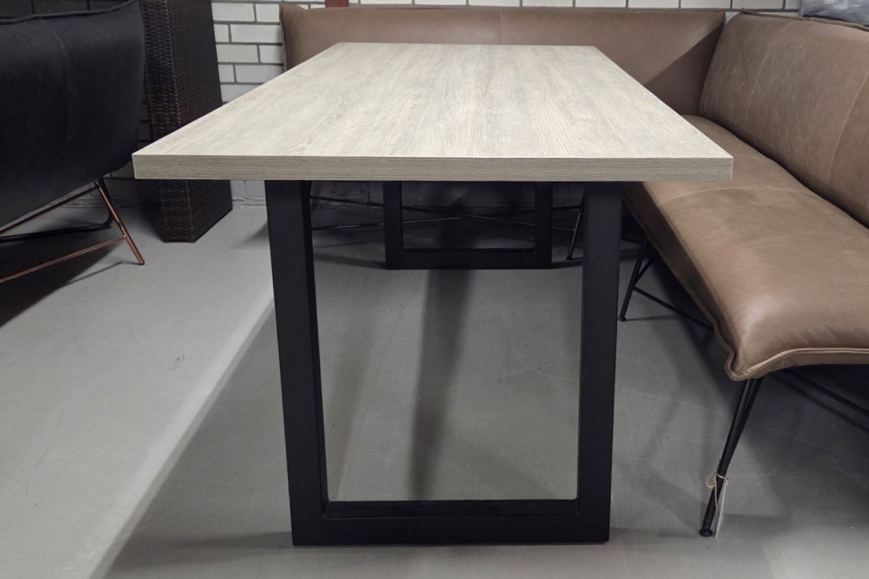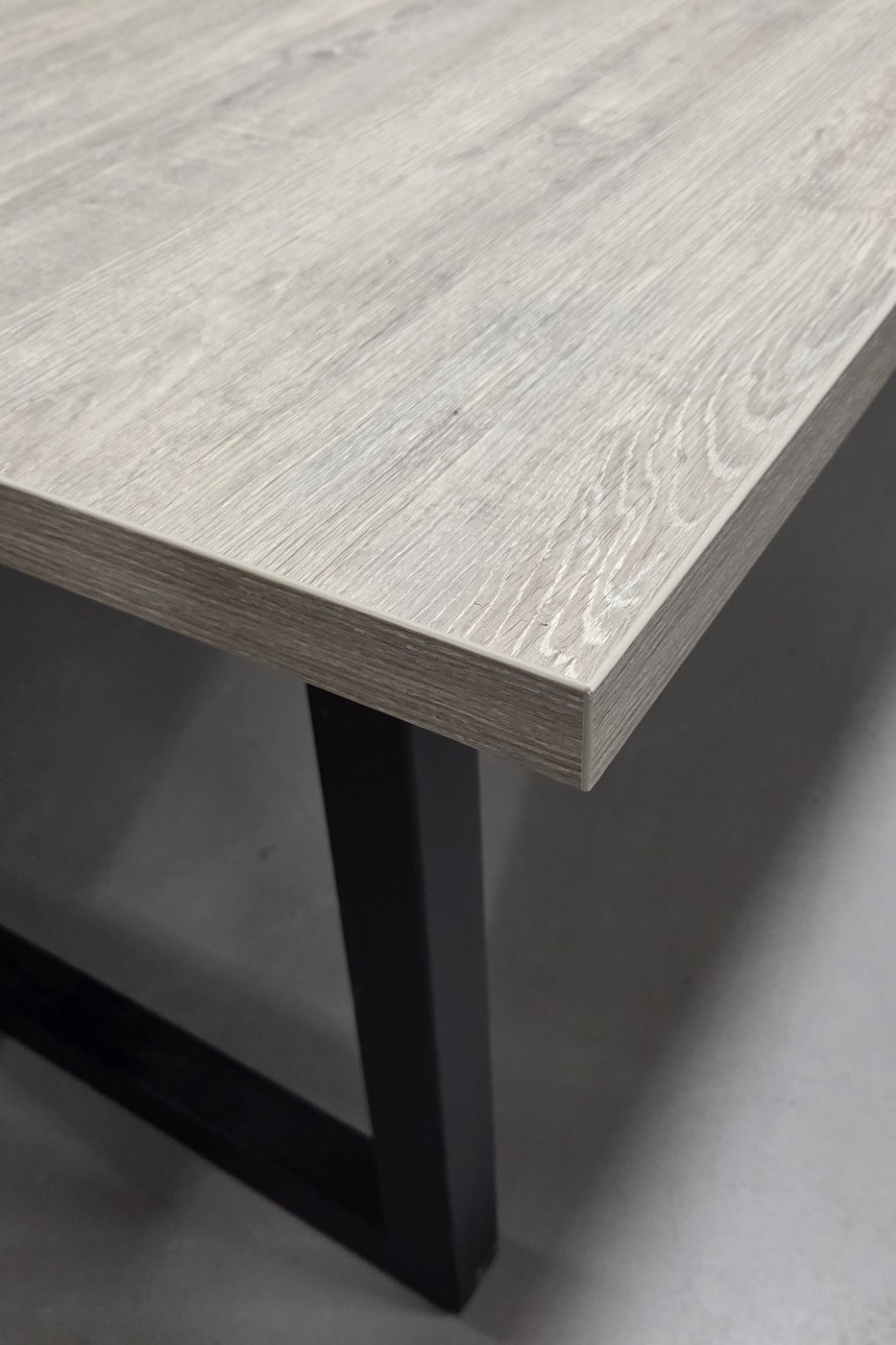 Het onderstel is een metalen U-poot en het blad is van Melamine met een grijze houtlook.