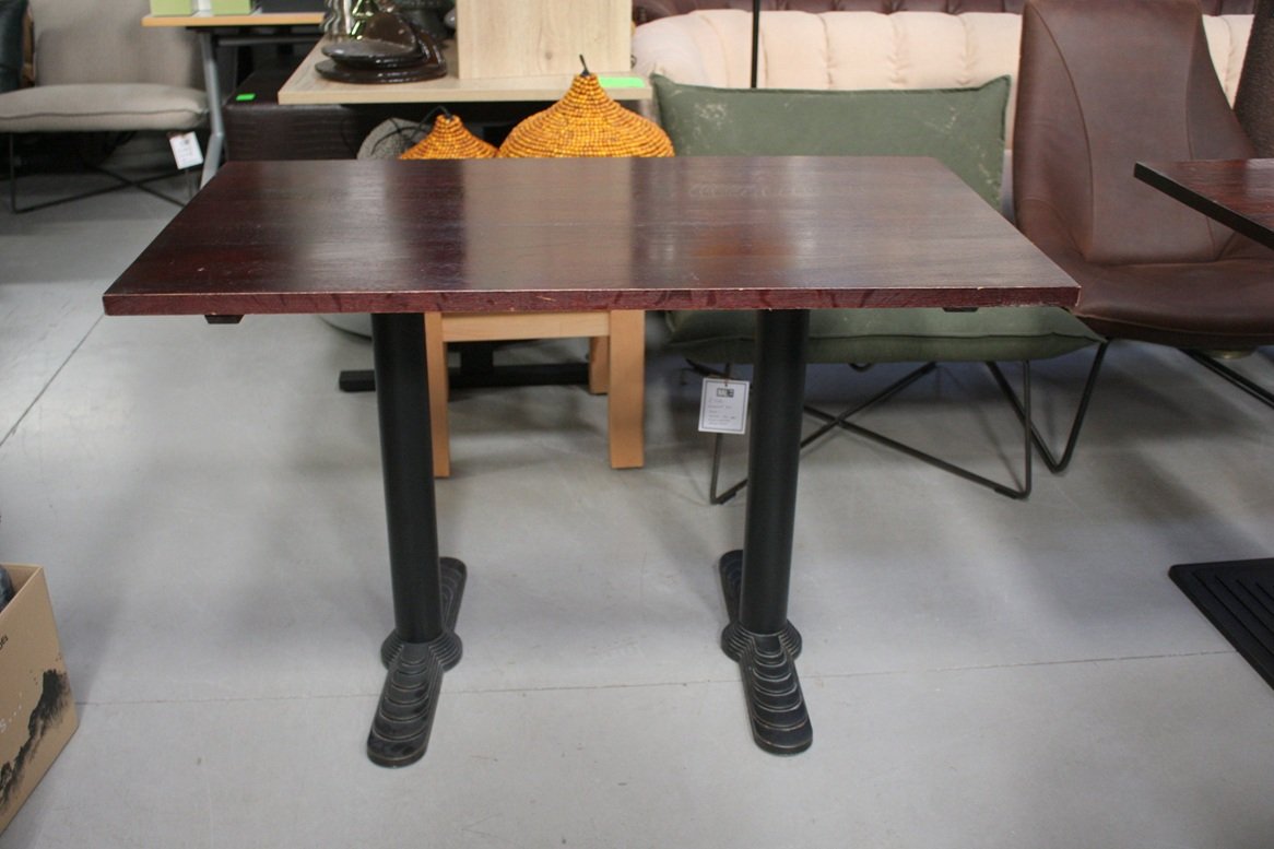 Gebruikte horecatafels met een zwarte metalen onderstel en een houten blad.