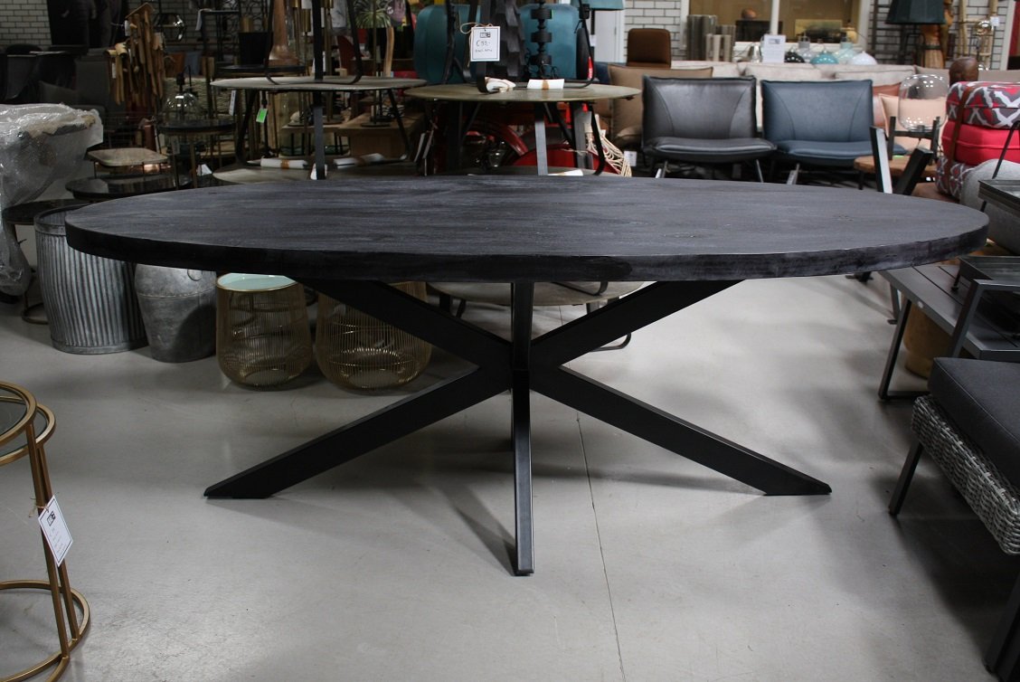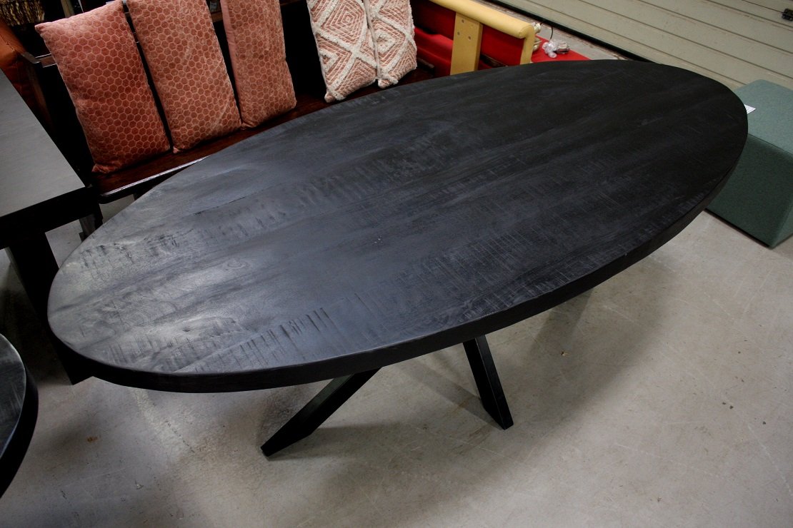 De tafel heeft een metalen onderstel en een mangohouten blad !