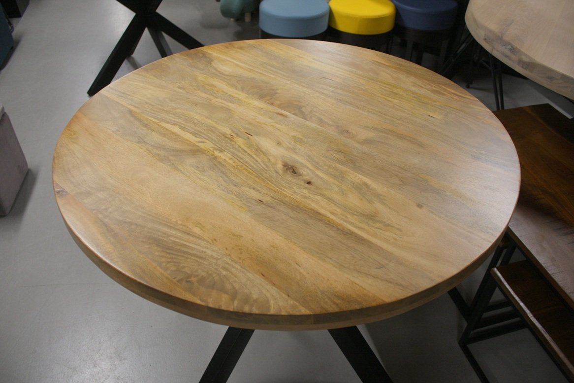 Ronde eettafel met een zwarte metalen kruispoot onderstel en een blad van mangohout naturel.