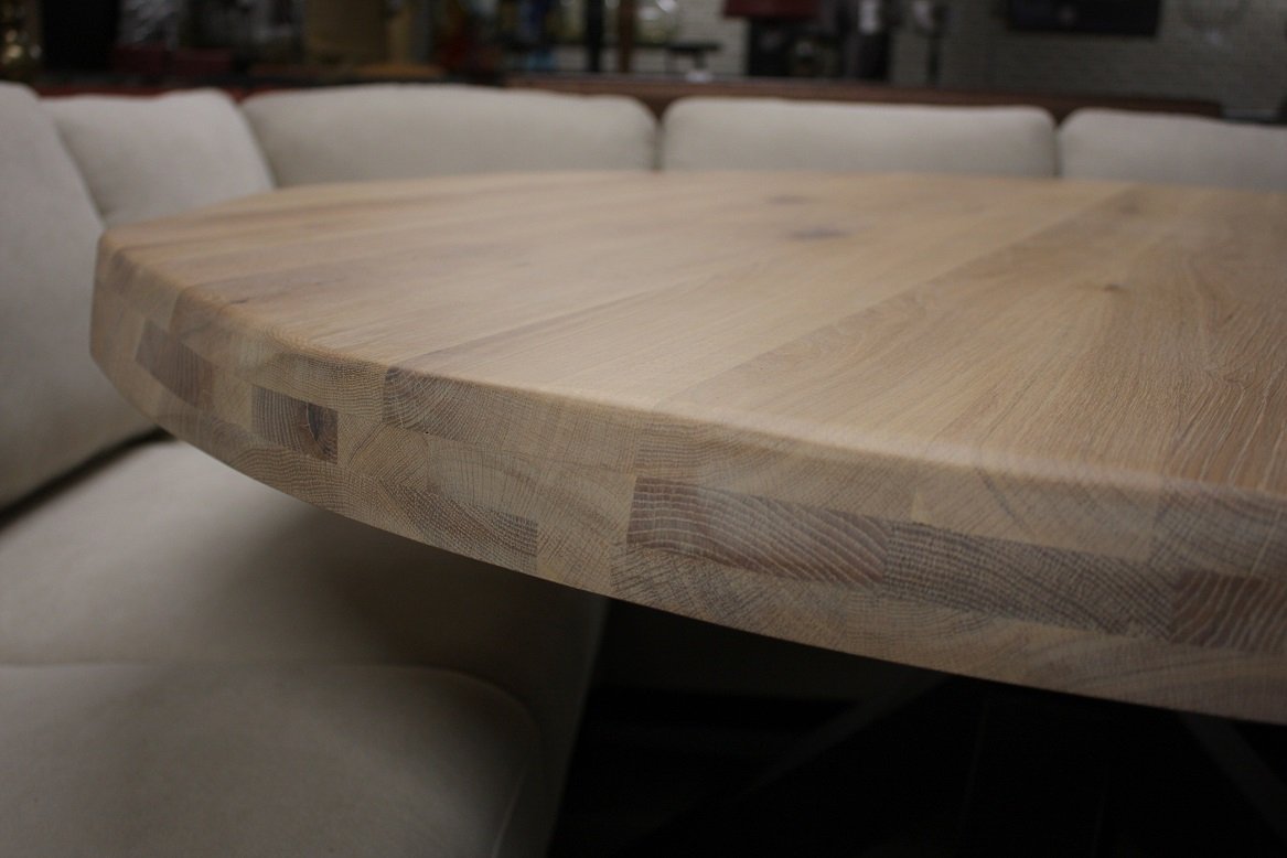 De tafels hebben een metalen onderstel en een dik massief eikenhouten blad ! (6 cm.)