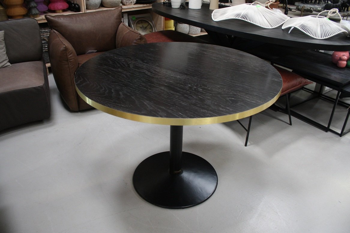 De tafel heeft een zwarte metalen voet, een houten blad afgewerkt met een goudkleurige band.