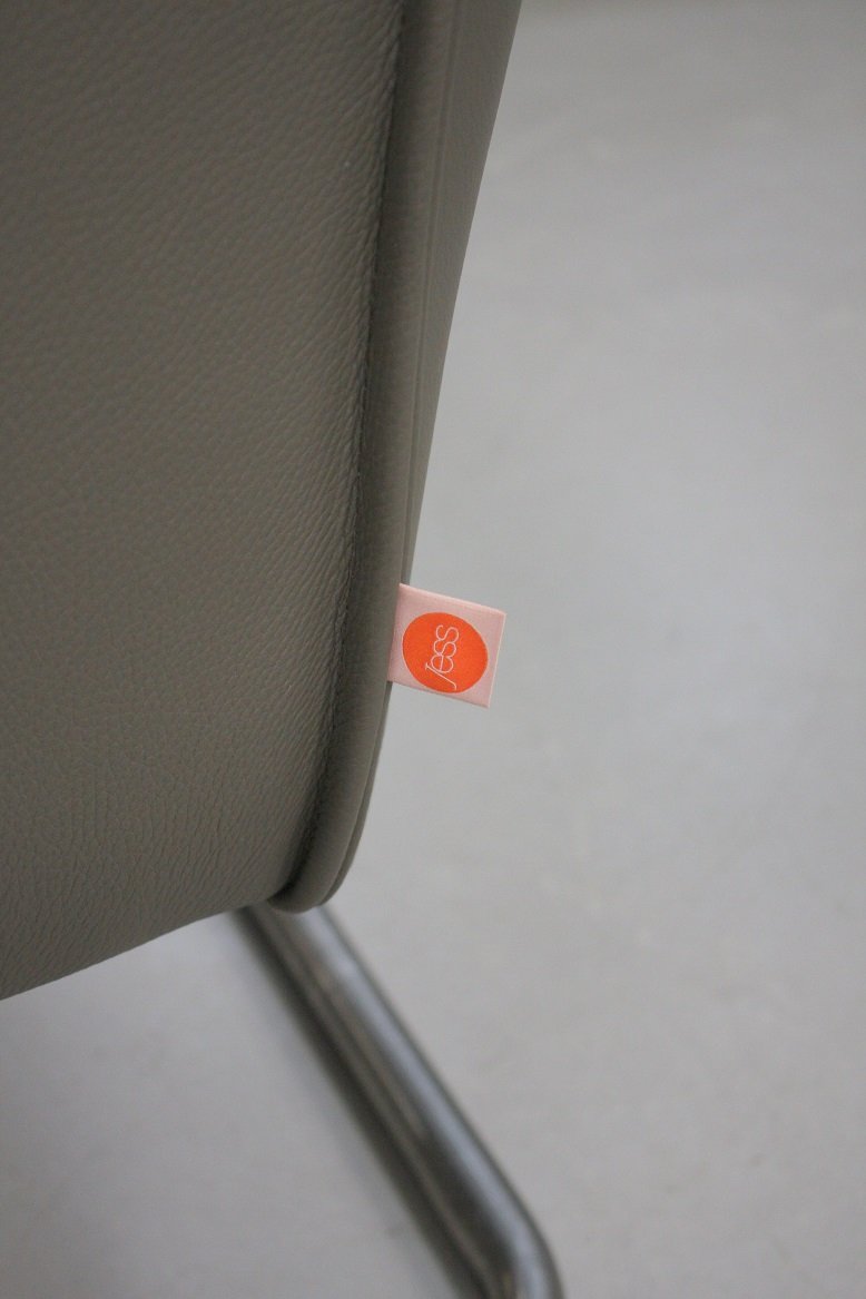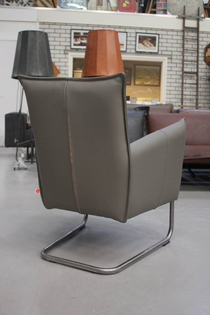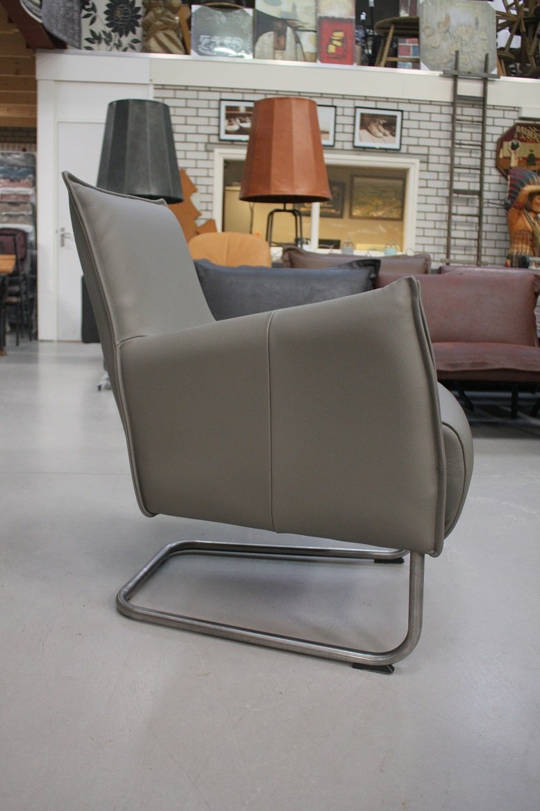 De fauteuil heeft een metalen frame en is gestoffeerd met echt leer in een mooie grijze kleur.