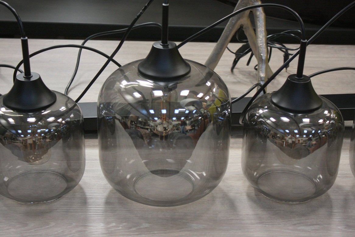 De lamp heeft een zwarte metalen plafondkap (110 x 7 cm) en 5 glazen kappen met rookglas. (Ø20 x 27 cm / Ø15 x 20 cm)