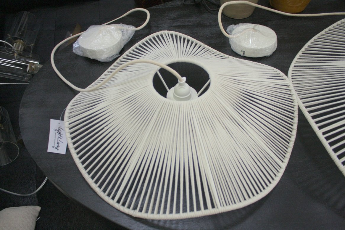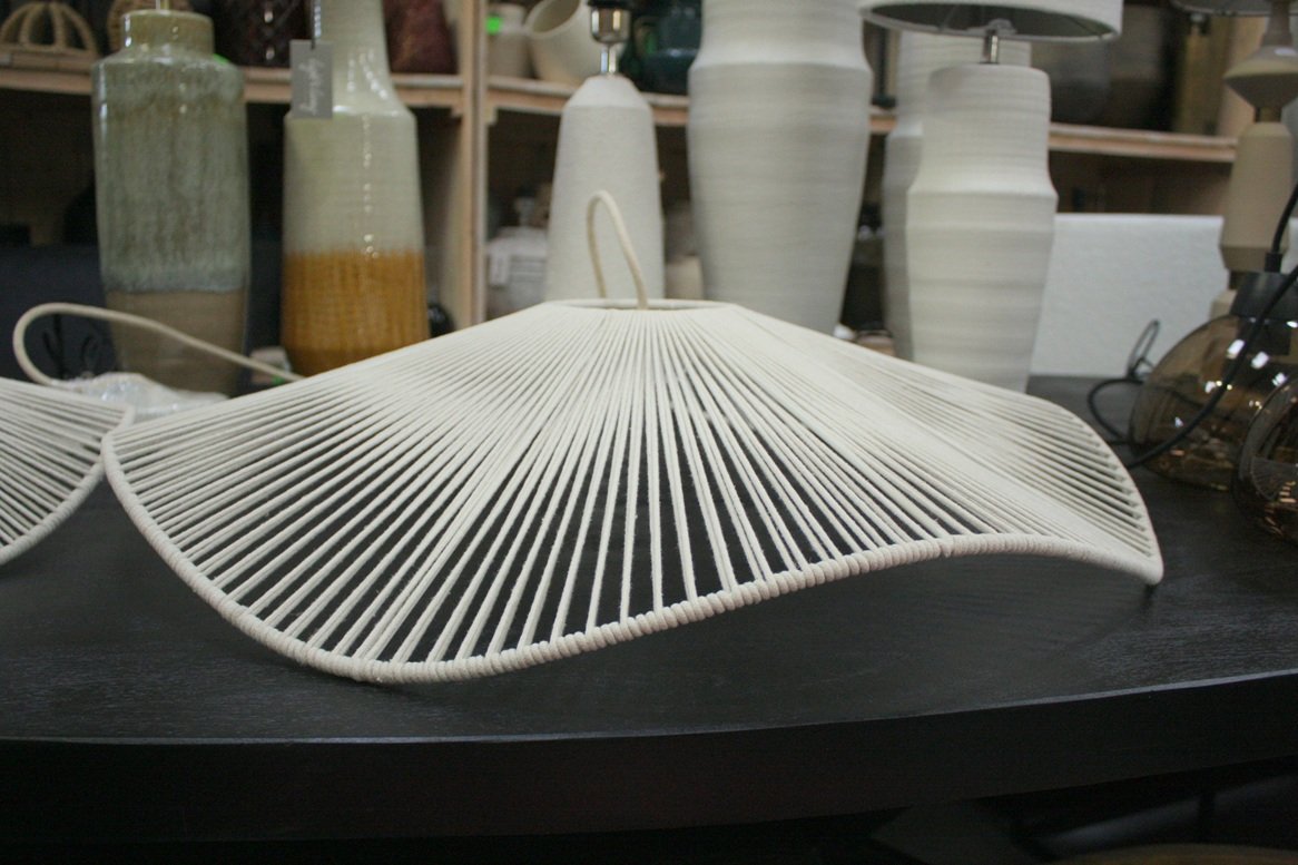 Het katoen is uitgevoerd in de kleur crème en is mooi gecombineerd met een wit stof omwonden snoer en een hoogglans witte plafondplaat.