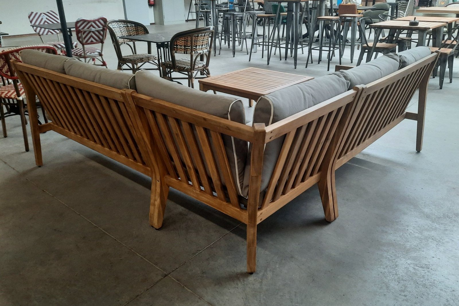 Het set is gemaakt van acaciahout en heeft fijne grijze kussens afgewerkt met een witte rand.