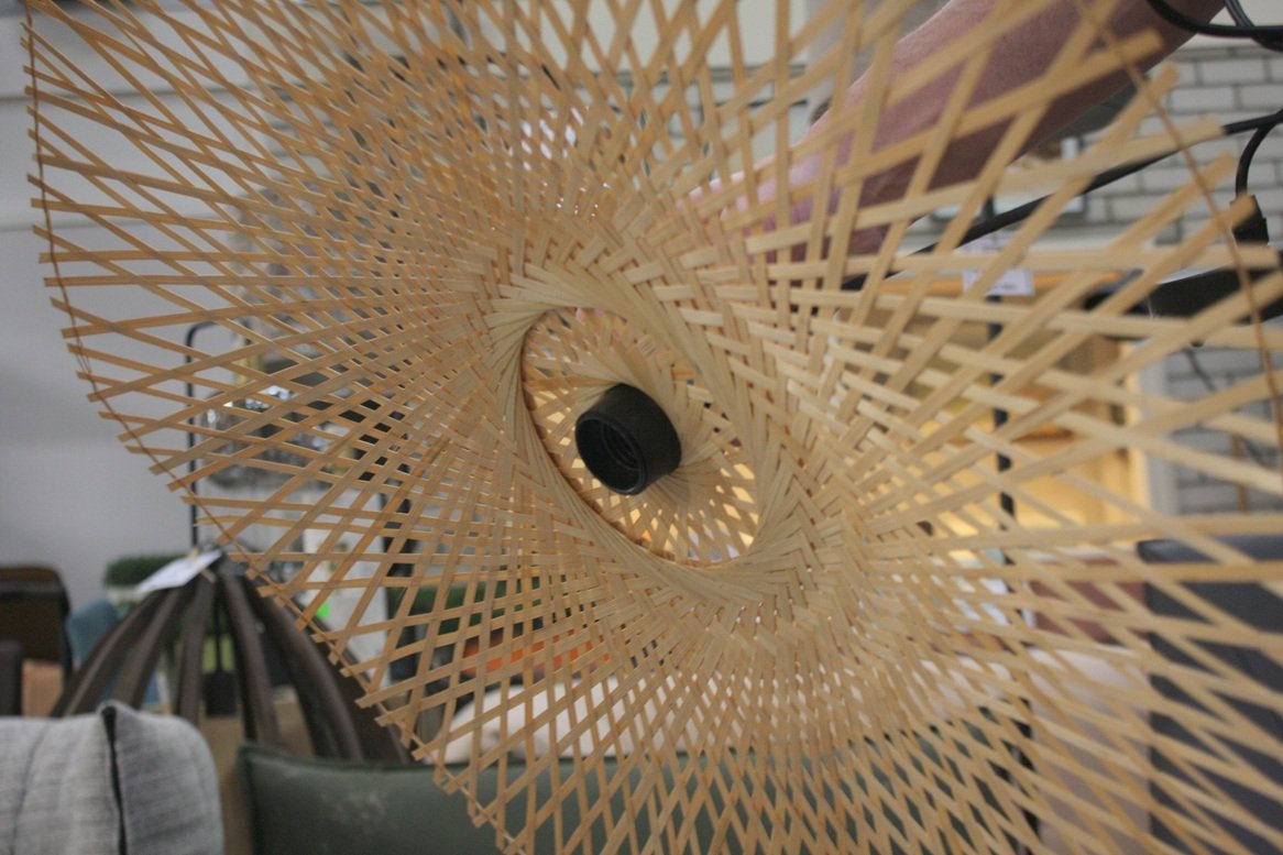 Hele mooie sfeervolle platte opengewerkte rotan hanglamp met een doorsnede van 70 cm.