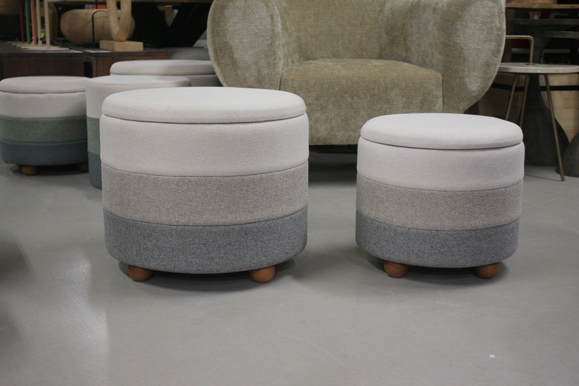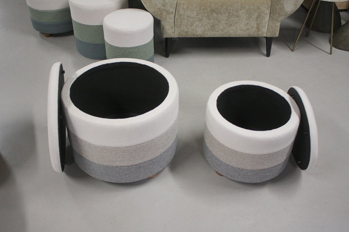 De poefen zijn gestoffeerd met mooie stof, hebben houten pootjes en hebben een opbergvak !