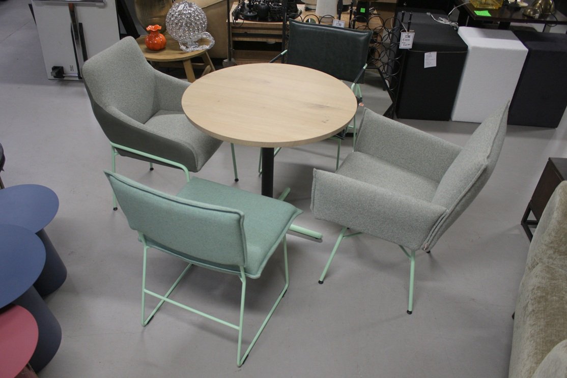 Het set bestaat uit een ronde eettafel en 4 eetkamerstoelen.