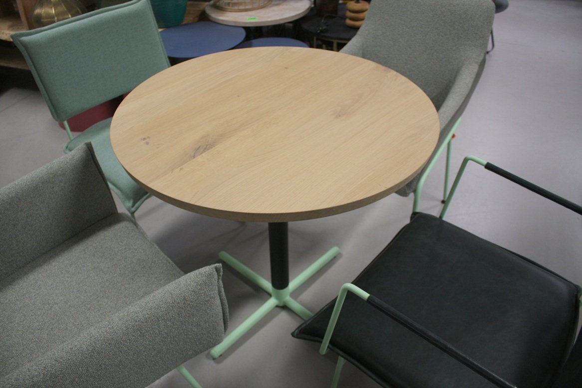 De tafel heeft een metalen onderstel in de combinatie zwart & mint en een blad van massief eikenhout.