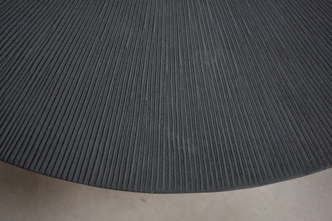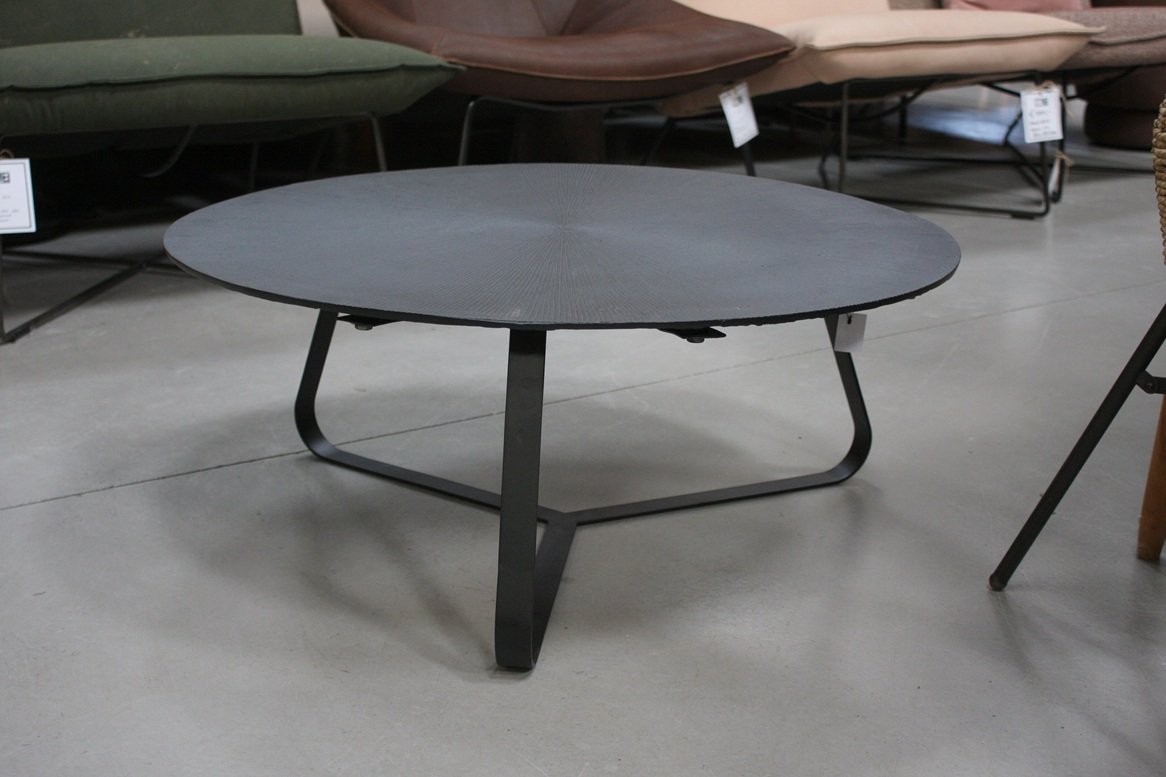 Ronde zwarte aluminium salontafel met een bewerkt blad van de Kae collectie.
