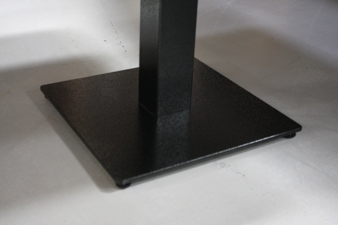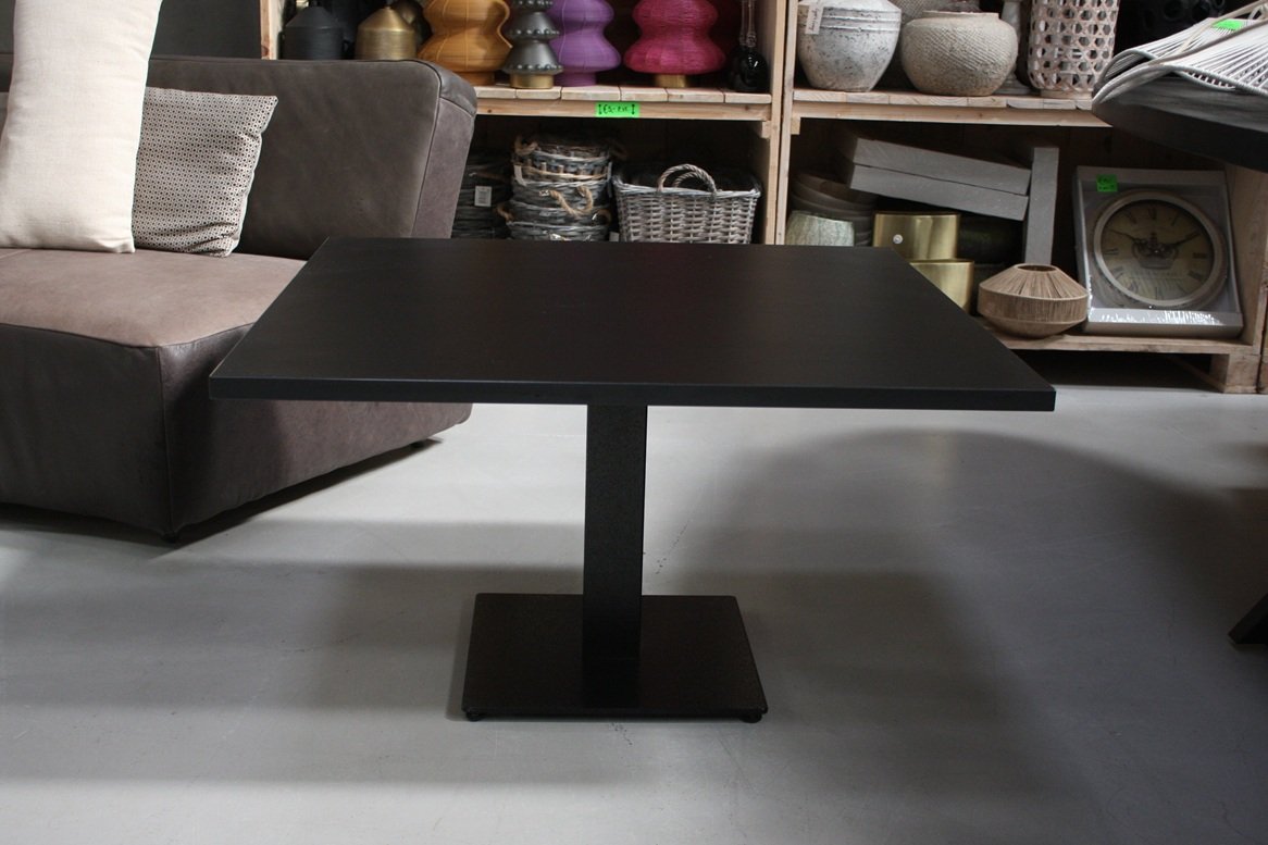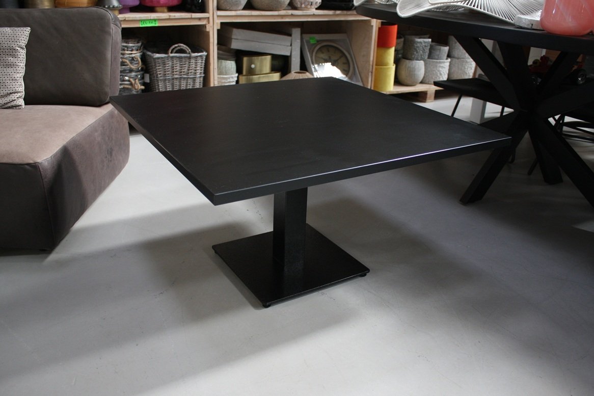 De salontafel heeft een zwarte metalen voet en een blad van zwart melamine.