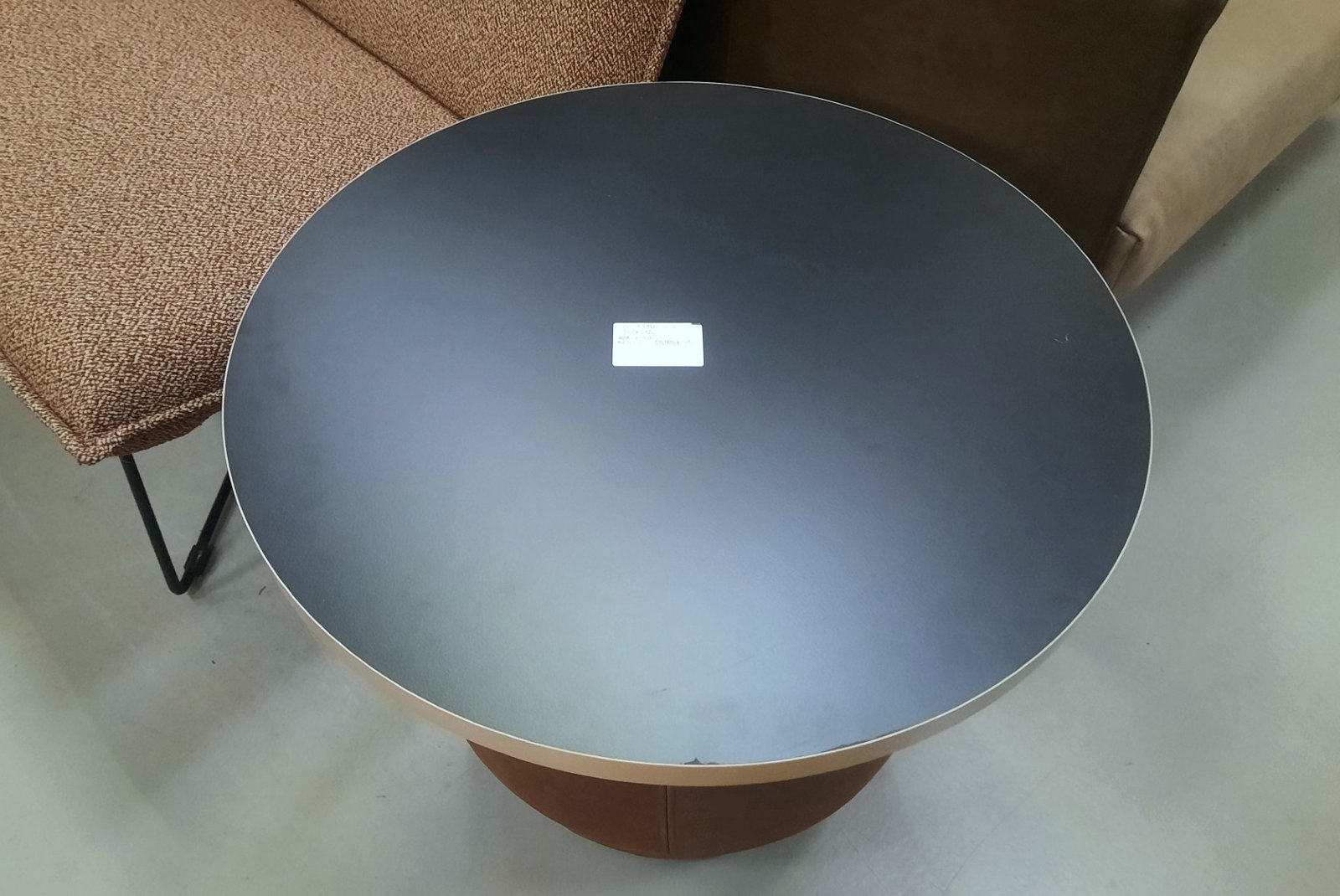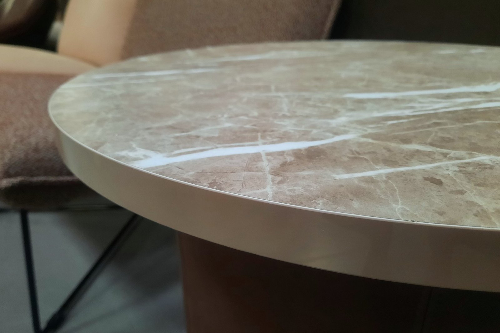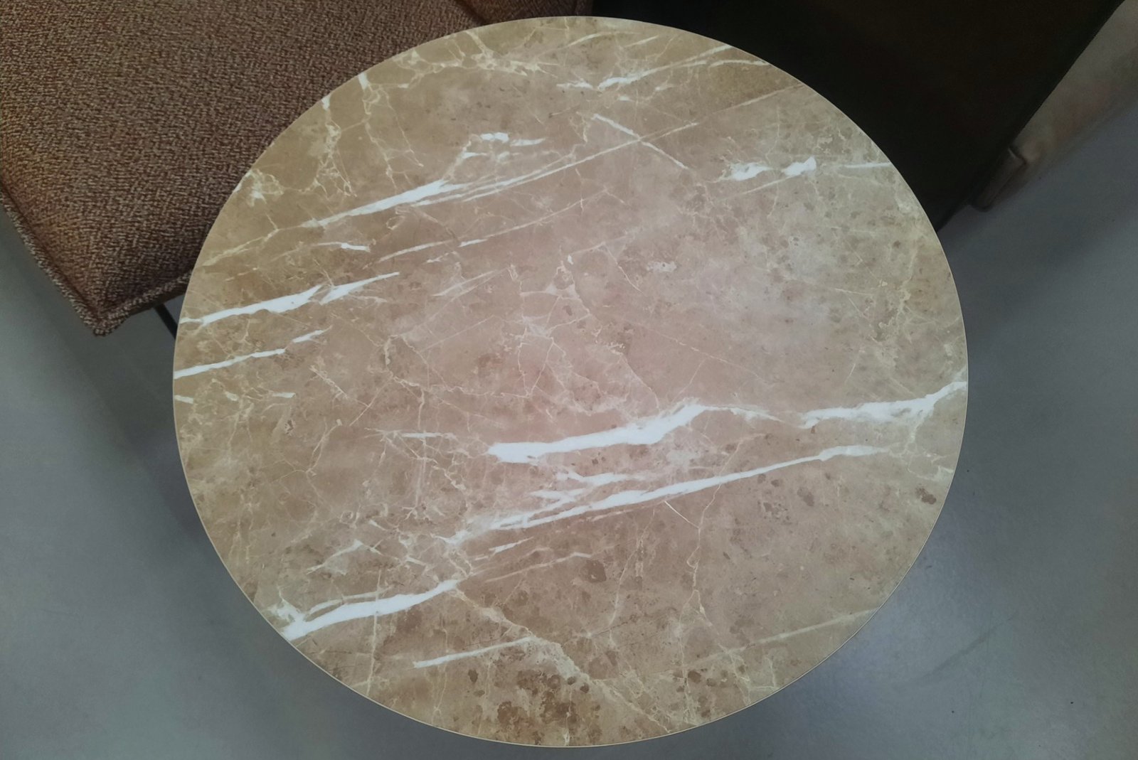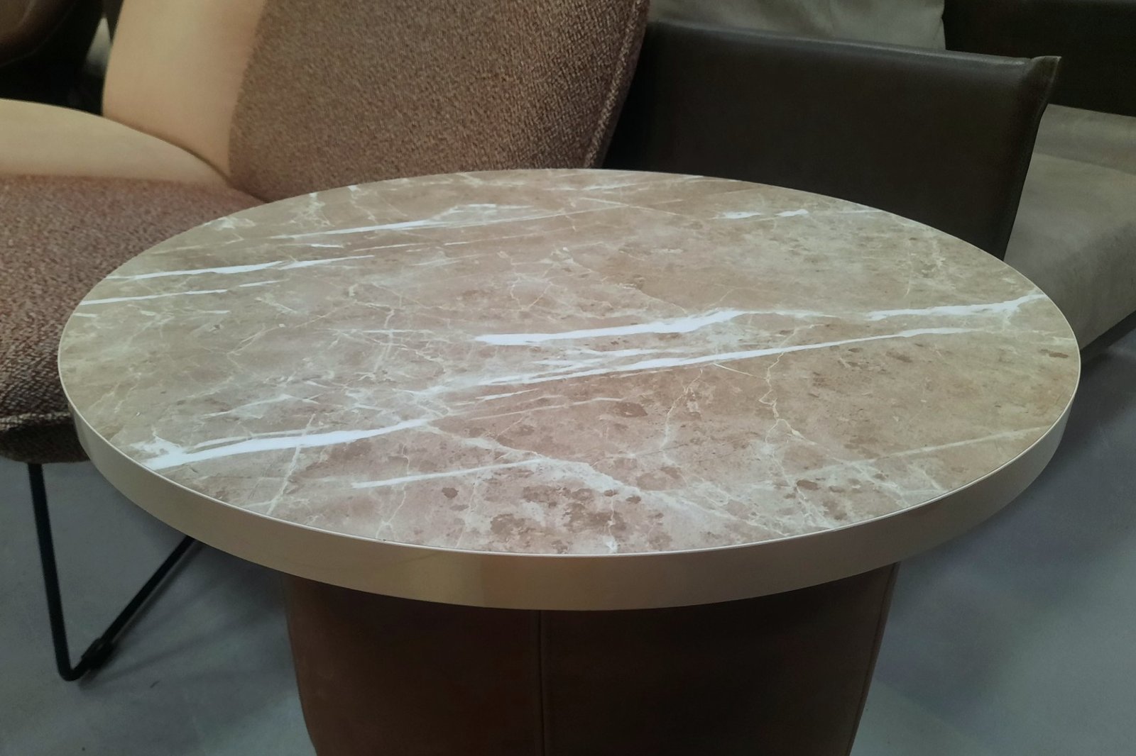 Nieuwe ronde melamine tafelbladen met marmerdessin en afgewerkt met een mooie rand.