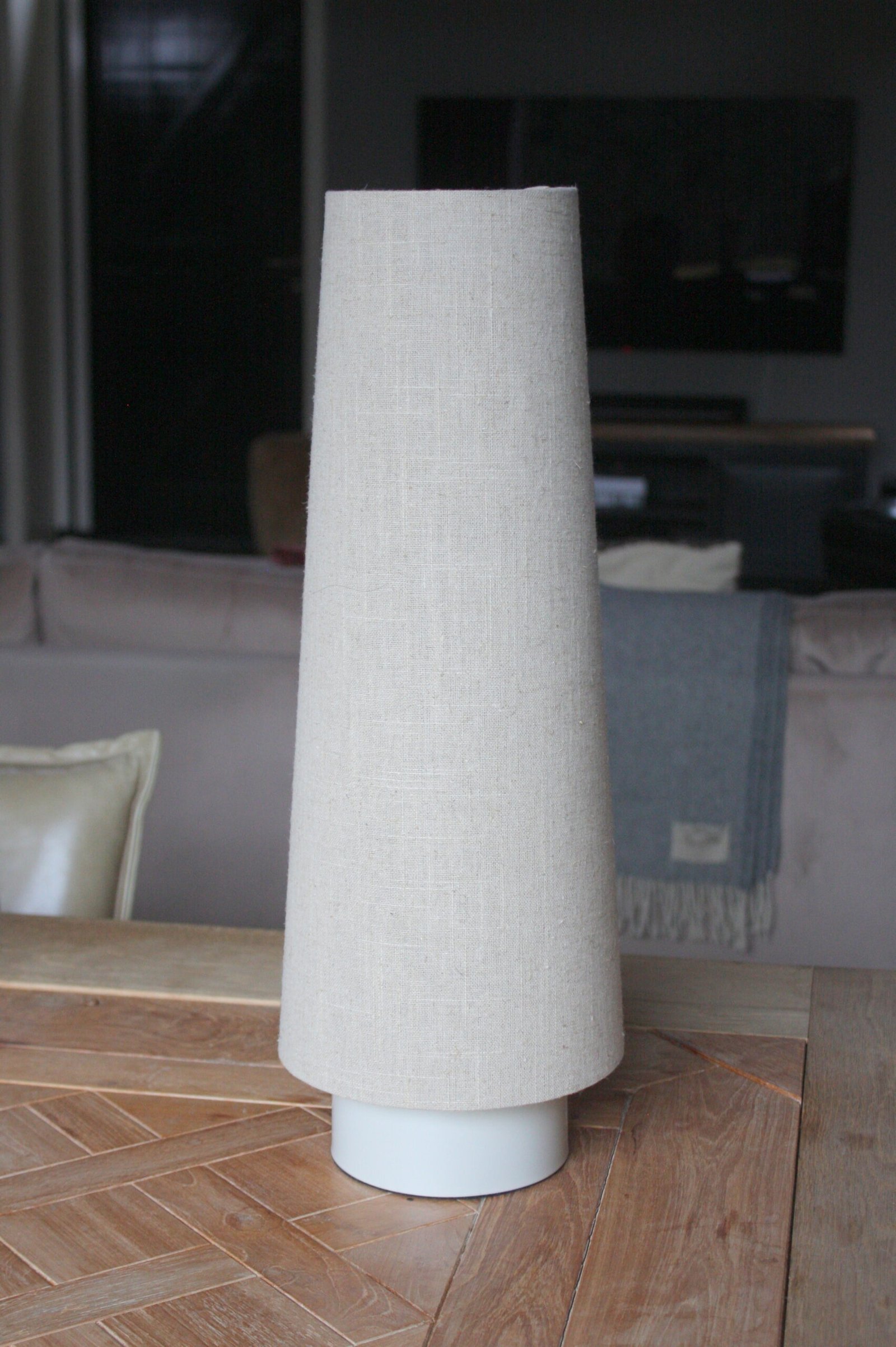 Sfeervolle tafellamp met een metalen voetje en een kap van linnen stof in een mooie naturel kleur.