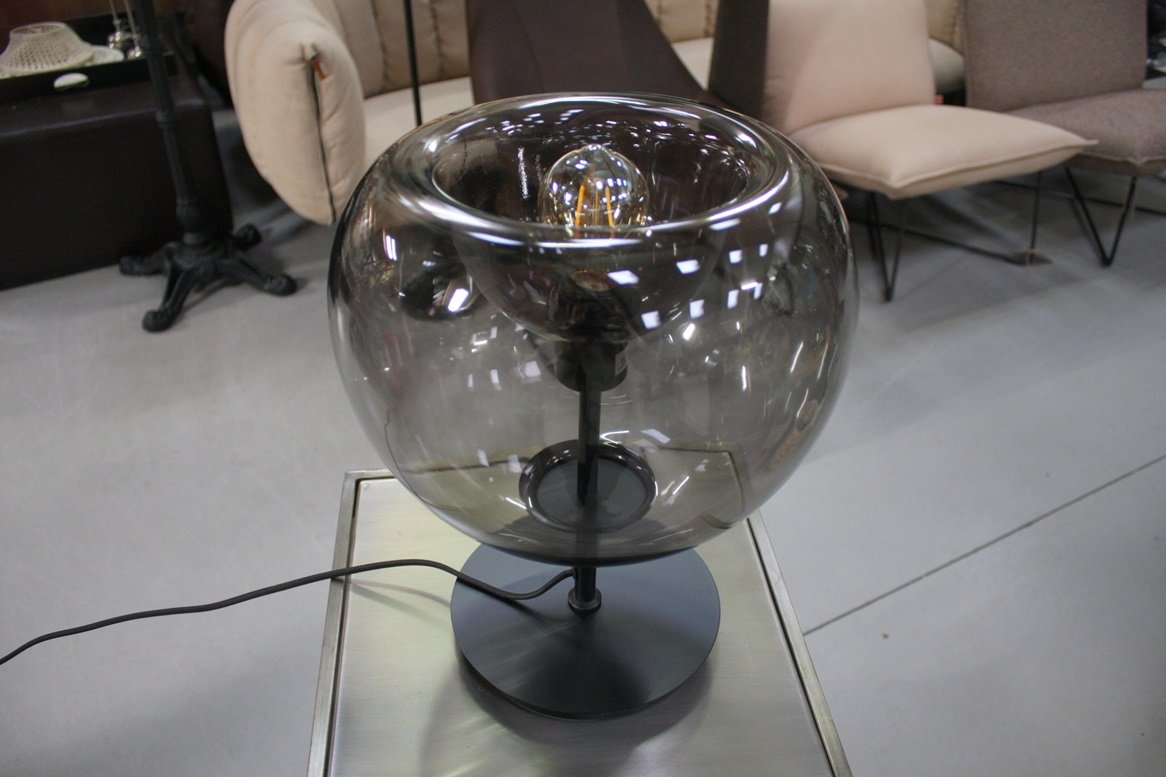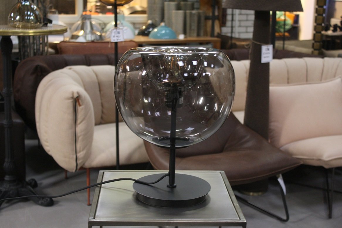 Ronde tafellamp met een zwarte metalen voet en een lampenkap van grijs glas.