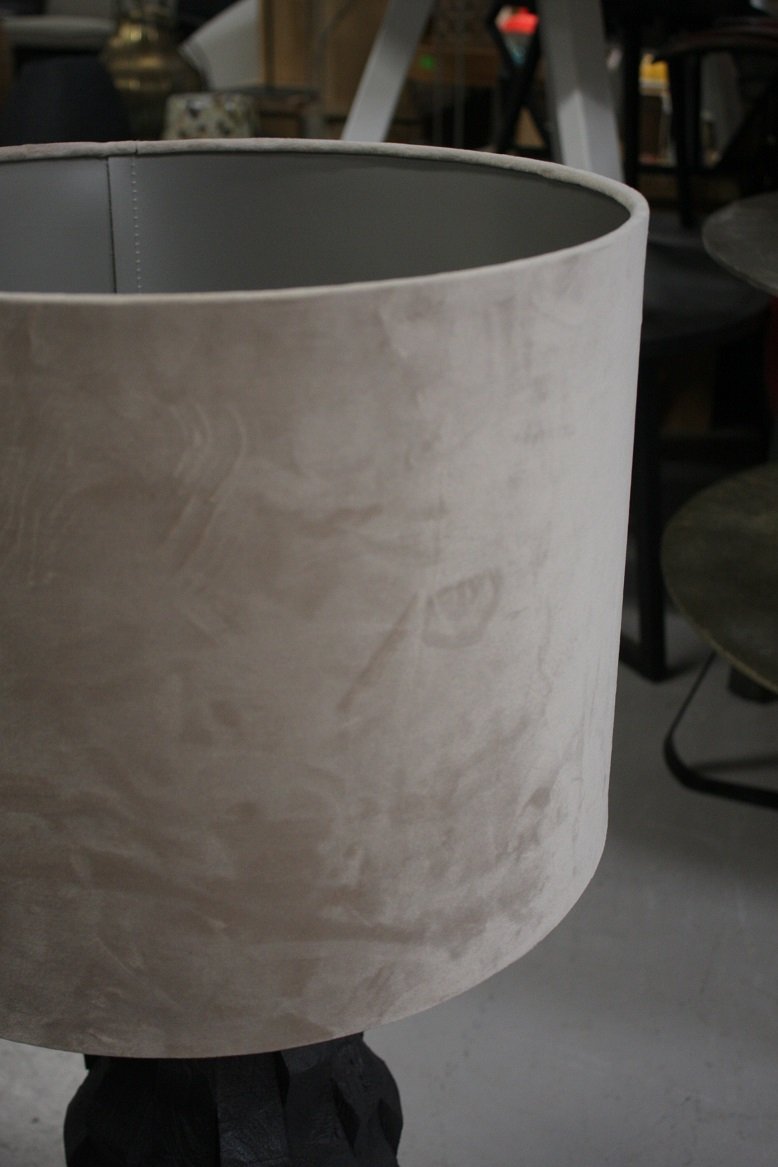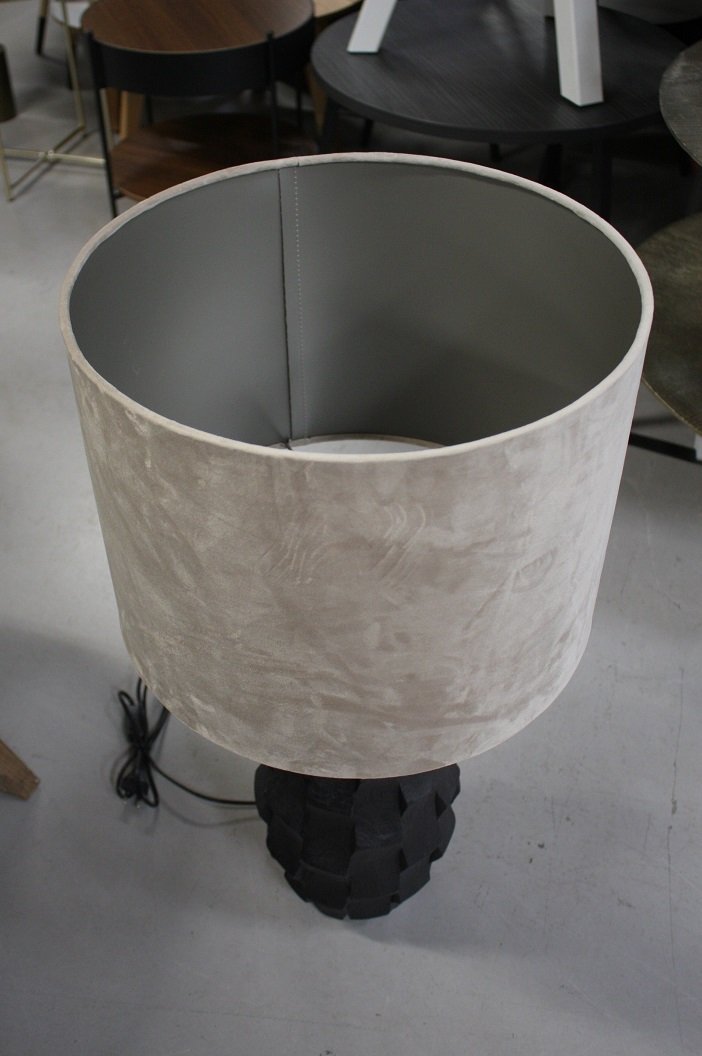 Prachtige tafellamp met een zwarte houten voet en een kap van velvet stof in een warme champagne kleur.