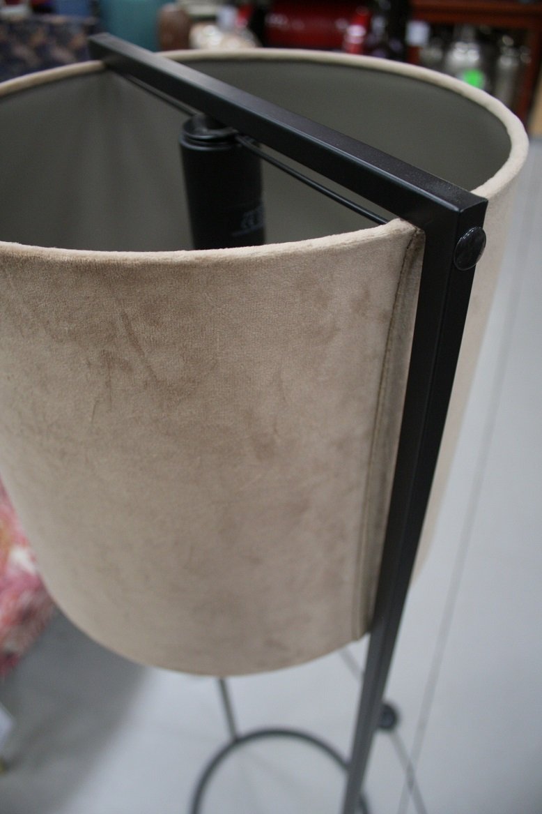De lamp heeft een zwart metalen frame en een kap van velvet stof.